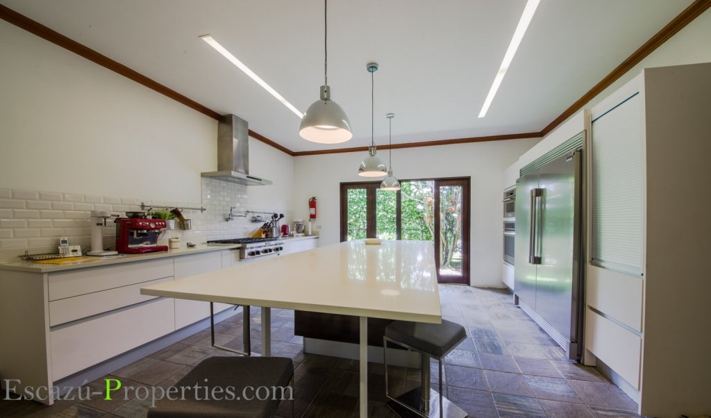 La espectacular cocina es moderna, amplia y muy bien equipada con todos los electrodomésticos que necesita en línea de lujo acero inoxidable. Muebles en madera blancos con sobres de cuarzo y un enchape en la pared en azulejos blancos al mejor estilo del metro de NY. Espaciosa mesa de trabajo en el medio del espacio que también se utiliza como desayunador. Desde aquí también se puede accesar al jardín para servir el área recreativa donde está la piscina.